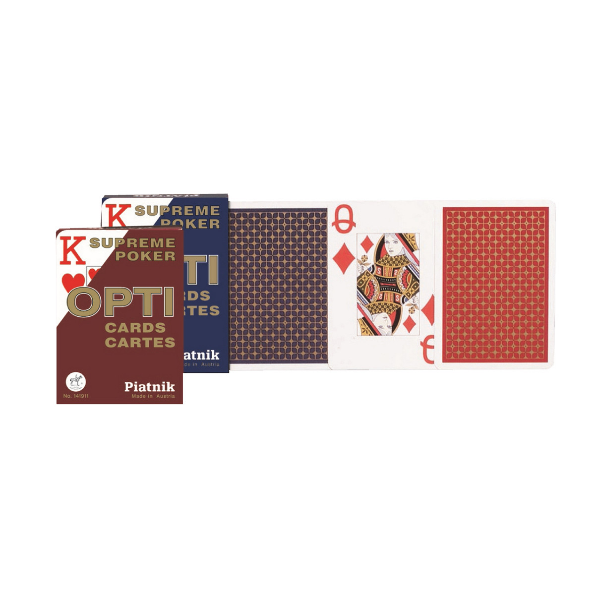 Карти гральні Опті покерні 1 колода х 55 карт Piatnik PT-141911. Гральні карти Опті покерні - стандартна колода зі збільшеним розміром індексу, її можна використовувати для будь-яких карткових ігор. Карти зроблені з високоякісного картону з ламінуванням. Ламінування покращує ковзання і довговічність карт. Сорочка може бути в червоному або синьому кольорі. Розмір карт стандартний, вони ідеально підходять для будь-яких карткових ігор. Колода складається з 52 основних карт, 2-х джокерів і промокарти.