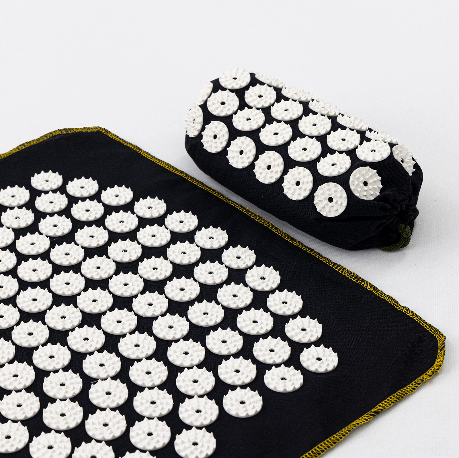 Характеристики килимка:2) Напівувалік - незамінний при масажному впливі на шию та поперек. Голки мають подвійне вістря, виконане за давньокитайською методикою для голчастого масажу "Квітка сливи". Конструкція голок перешкоджає глибокому проникненню голок у шкіру, надаючи лікувальній процедурі більший комфорт та ефективність. Колючі елементи виготовлені з якісного пластику та мають щільне кріплення з тканиною завдяки термічним напайкам.