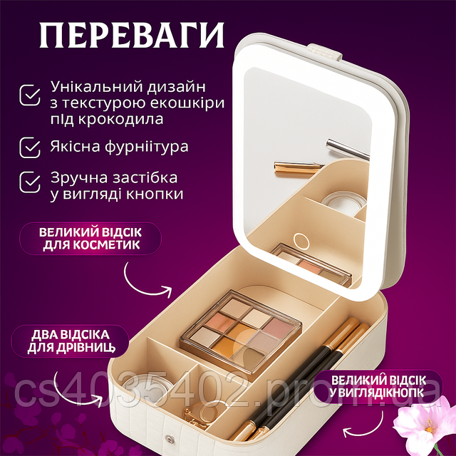Елегантна шкатулка-косметичка з підсвіткою та дзеркалом — це стильний та практичний аксесуар для догляду за собою. Завдяки вбудованому акумулятору великої ємності підсвітка працює довго без частих підзарядок. Три режими освітлення дозволяють обрати оптимальне світло для макіяжу, догляду за шкірою чи прикрасами. Виготовлена з високоякісної штучної шкіри, шкатулка має розкішний вигляд і відрізняється довговічністю.