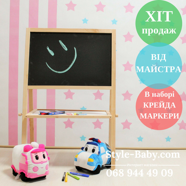 Особливості двостороннього мольбертаРозмір мольберта: висота 100см., висота дошки 40 див, ширина дошки 50 див.
