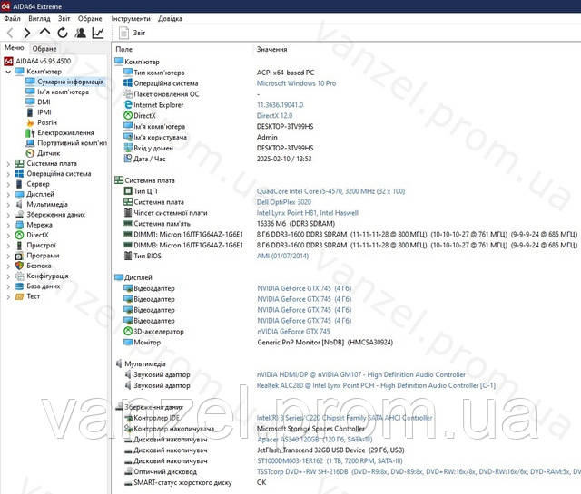 Dell OptiPlex 3020 Tower / Intel Core i5-4570 - 4 ядра по 3,2 ГГц - 3,6 ГГц / 16 Гб DDR3 / Відеокарта NVIDIA GeForce GTX 745 4Гб GDDR3 128-bit / 120 Гб SSD / 1000 Гб HDD / USB 3.0 / DVD-RW / Windows 10 Pro
