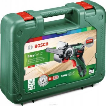 Легка (0,9 кг) ручна пила Bosch EasyCut 12, що працює від Li-Ion 12 В або 10,8 В акумулятора знадобиться для обрізання гілок, розпилювання невеликих деталей із деревини (глибина різу 65 мм) і пластмаси (30 мм). Особливість пилки — застосування інноваційної технології NanoBlade, за якої розпилювання стає простішим і швидше. Як пиляльну насадку застосовується мінішина NanoBlade з обертовою мікроланцюжком. Регульована швидкість пиляння 0-4100 хід. Сталевий упор. SDS система кріплення пилки. Антивібраційна система. Доставляється в пластиковій валізі з елементом живлення 12 В, 2,5 А| год, зарядкою, прозорим захисним кожухом, петлею кріплення, нанолезом.