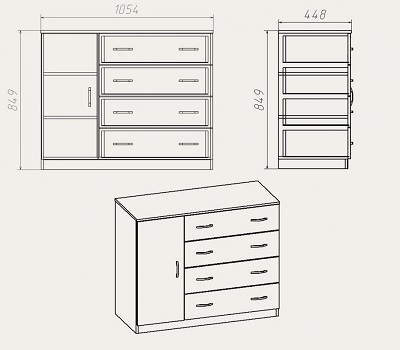 Габаритні розміри: ширина 1054 мм; висота 849 мм; глибина 448 мм.
