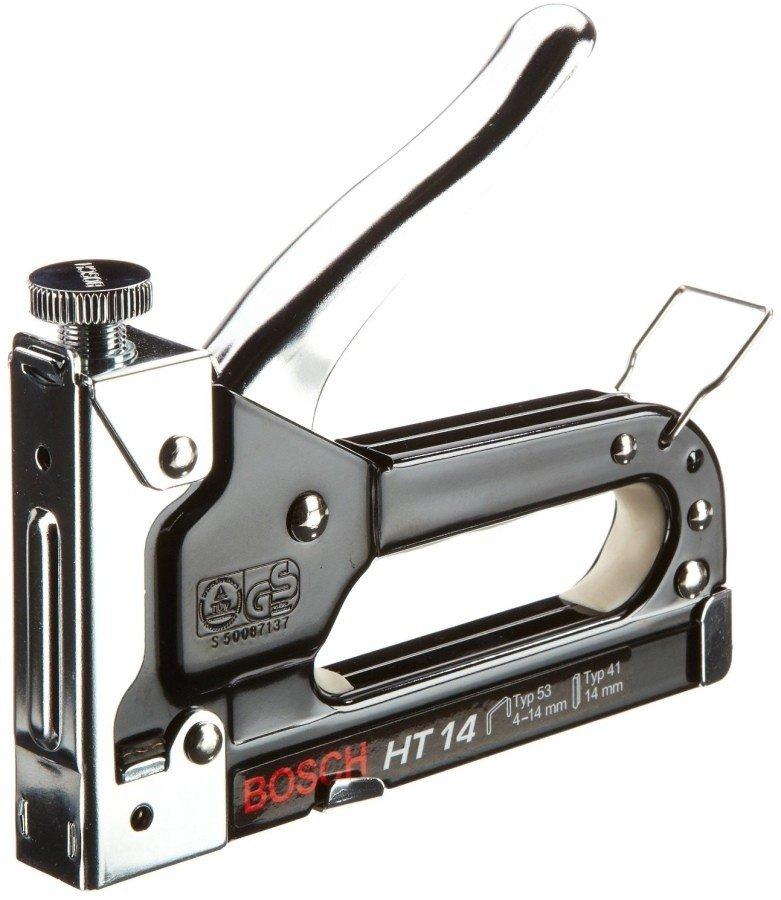 Будівельний степлер BOSCH HT 14 — незамінний ручний інструмент, призначений для скріплення поверхонь, швидкої оббивки або ремонту меблів. Використовується під скоби 4 -14 мм і штифти завдовжки 14 мм.